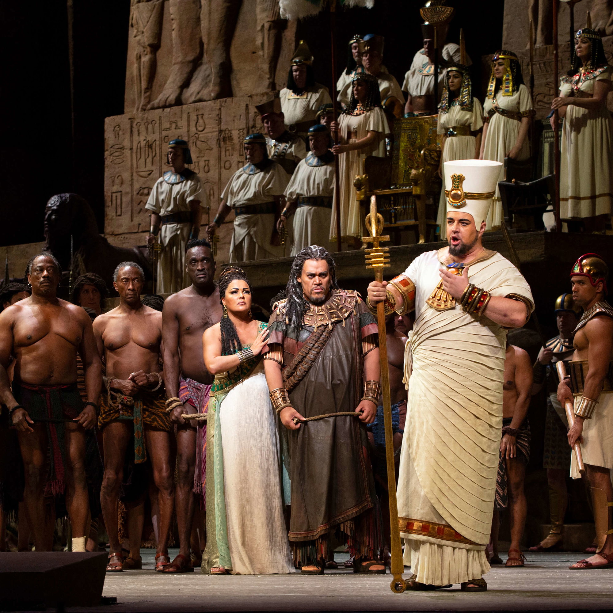Pod taktovkou dirigenta Nicoly Luisottiho se titulního partu etiopské princezny a otrokyně zhostila sopranistka Anna Netrebko, ztvární tak svou první Aidu na prknech Metropolitní opery. Po boku ikonické rodačky z Krasnodaru stane lotyšský dramatický tenorista Aleksandrs Antonenko jako egyptský vůdce Radames. V roli Aidiny rivalky a žárlivé sokyně Amneris se v této impozantní inscenaci představí skvělá gruzínská mezzosopranistka Anita Rachvelishvili.