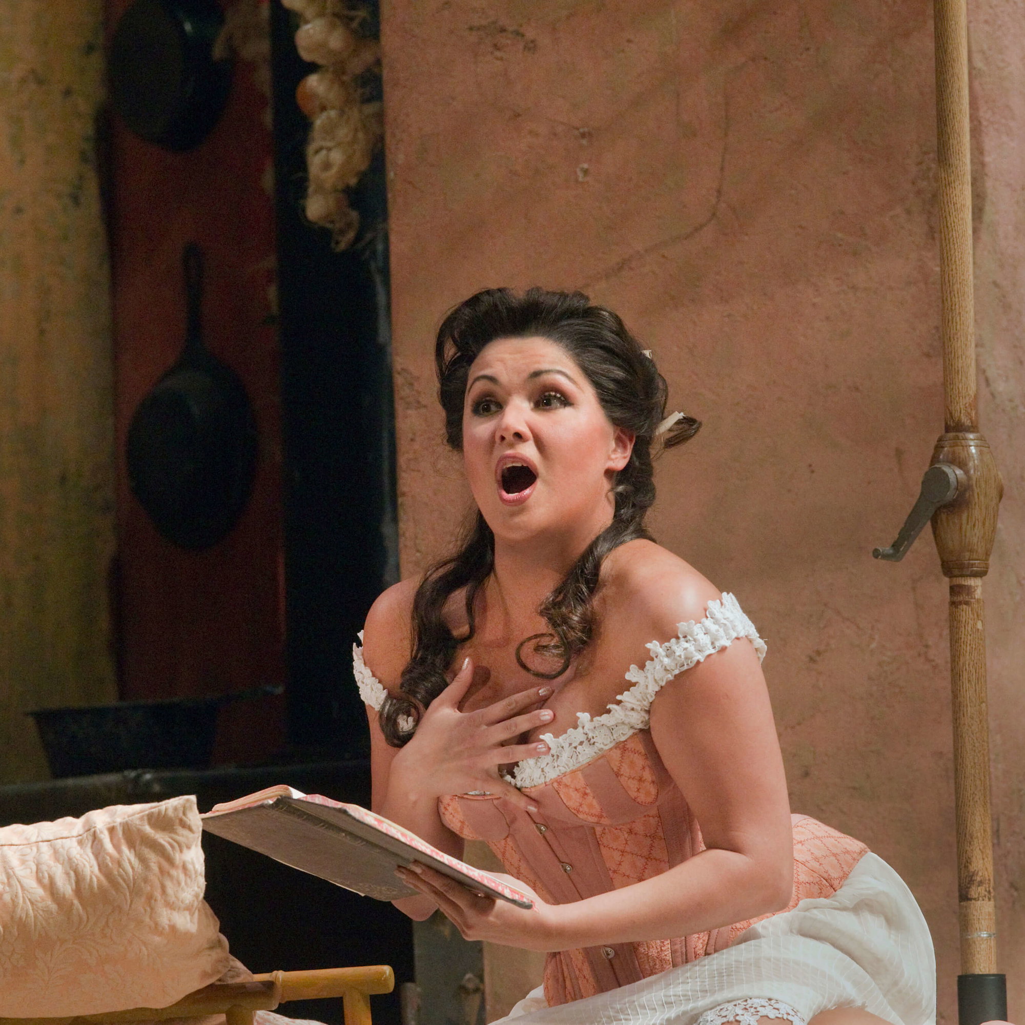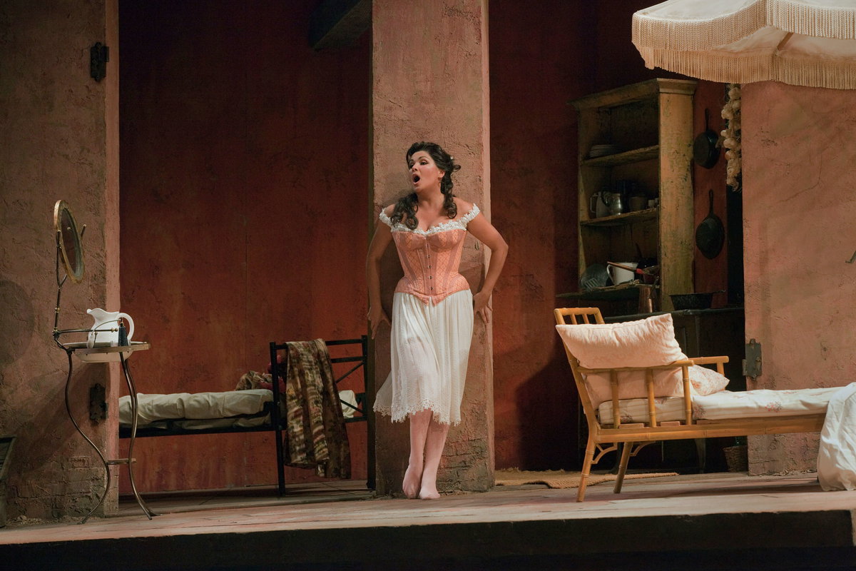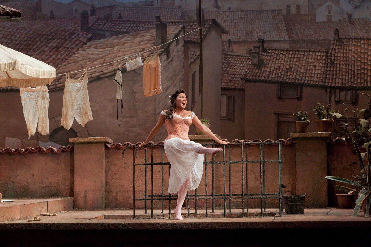 Hvězdná Anna Netrebko jako mladá vdova Norina v komické opeře Gaetana Donizettiho.