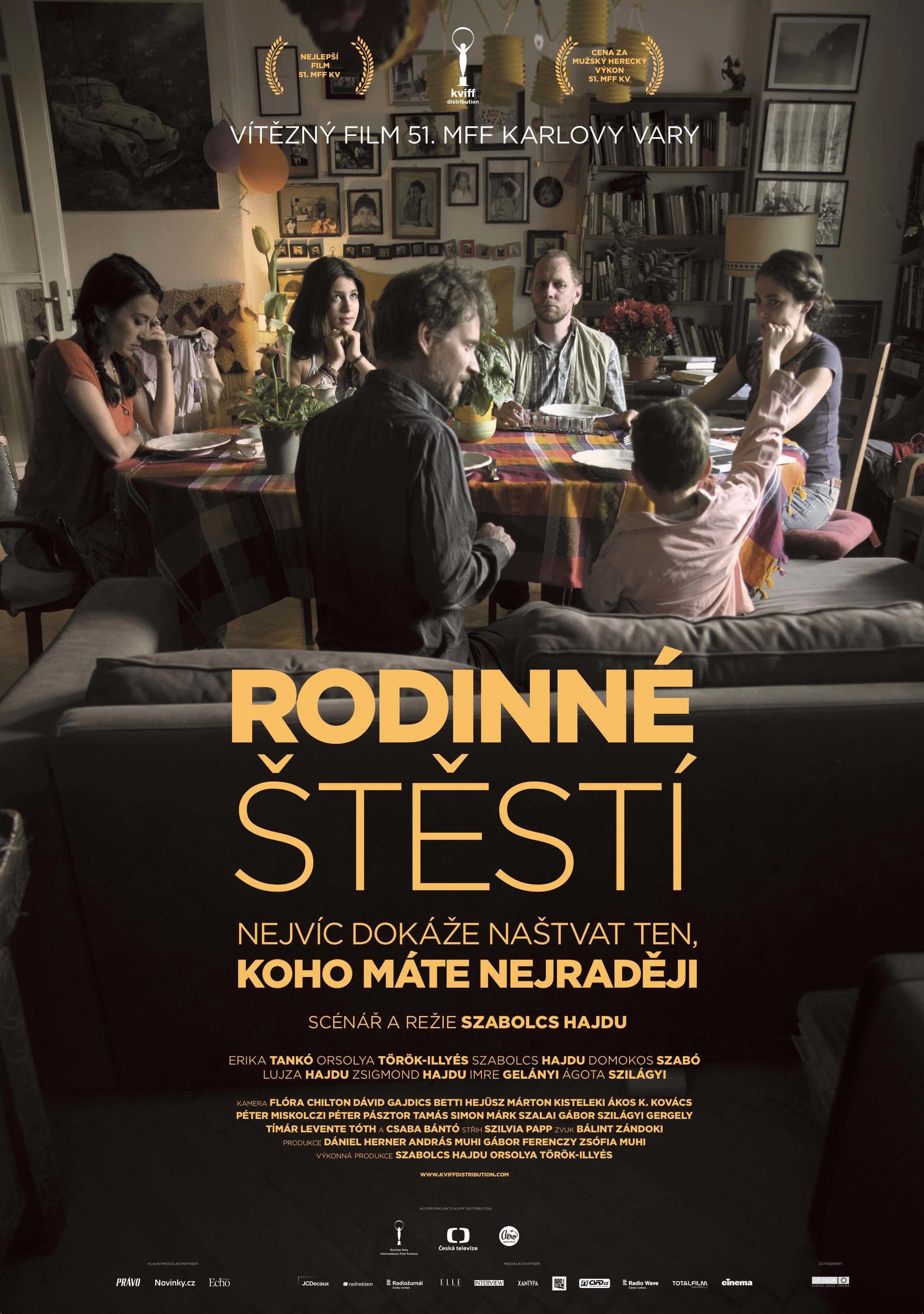 Když má velká většina diváků v sále na film stejný názor, je to poměrně vzácný úkaz. Tím spíše, je-li to názor pozitivní. A když film stejně nadšeně vnímá i kritika a festivalová porota? To je vrcholně nepravděpodobný, skoro zázračný okamžik. Takovou magickou chvilku jsme zažili ve Velkém sále karlovarského hotelu Thermal při projekci Rodinného štěstí. Publikum si tvůrci naklonili už při příchodu početné delegace – charismatický režisér Szabolcs Hajdu do Varů přivezl svou rodinu, která ve filmu hraje 4 z 6 hlavních rolí, i kompletní ročník jeho studentů na filmové škole, kteří se při natáčení střídali za kamerou. Následovalo 81 minut projekce: napjaté ticho střídané výbuchy smíchu, standing ovation, dojetí. O pár dnů později získal film, natočený bez státní podpory za neuvěřitelně směšných 5000 Euro, na 51. MFF KV hlavní cenu i ocenění pro nejlepšího herce. A my si nedokážeme představit lepšího kandidáta pro distribuci pod labelem KVIFF Distribution než tohoto chytrého, zábavného, nezávislého vítěze letošního festivalu.