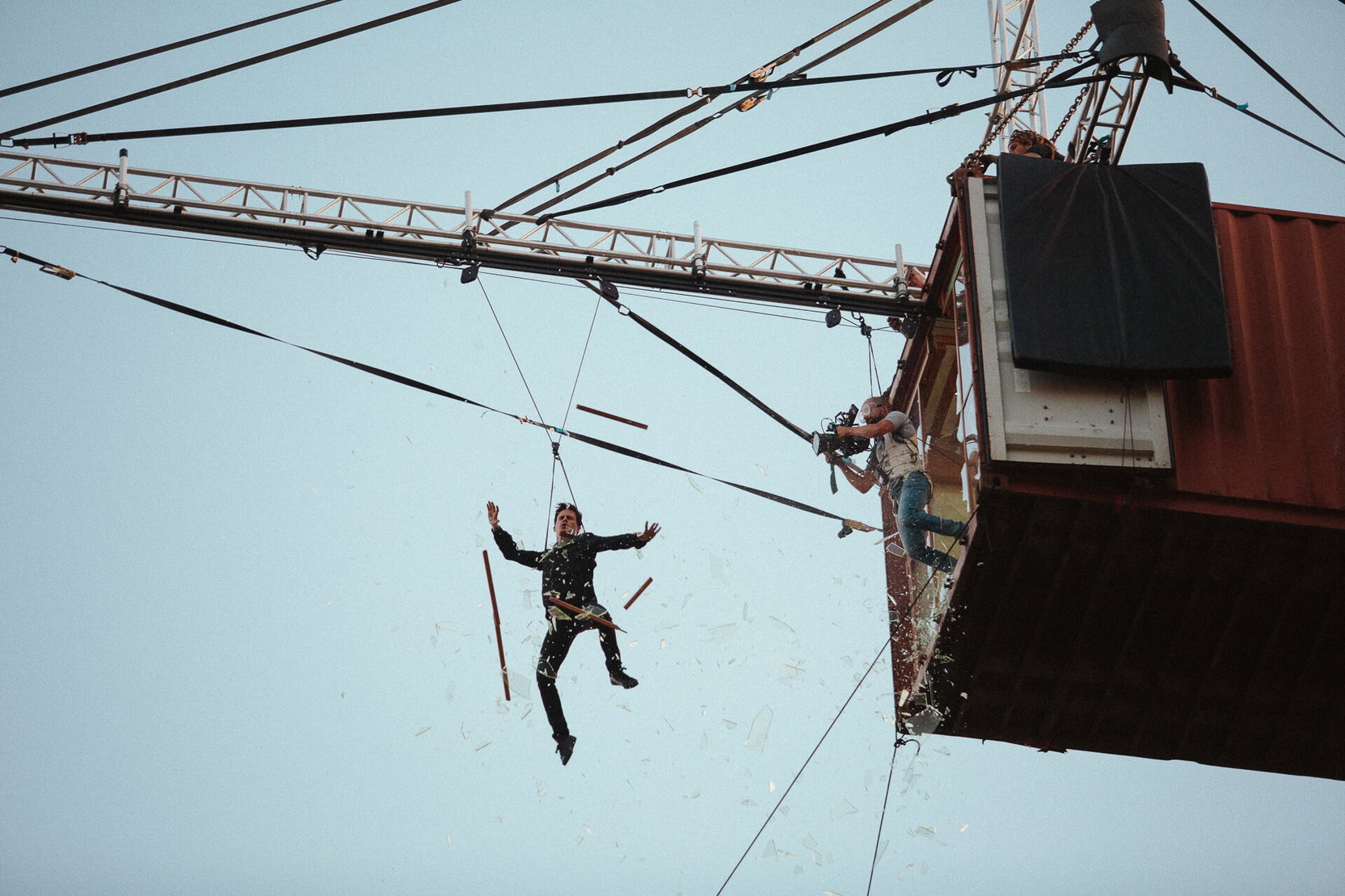 „Natáčeli jsme na 35mm film a kamery jsme ve většině případů fixovali na dráty, lana nebo konstrukci, která umožňovala jejich pohyb 360 stupňů okolo létajícího herce, který se otáčel kolem vlastní osy.“