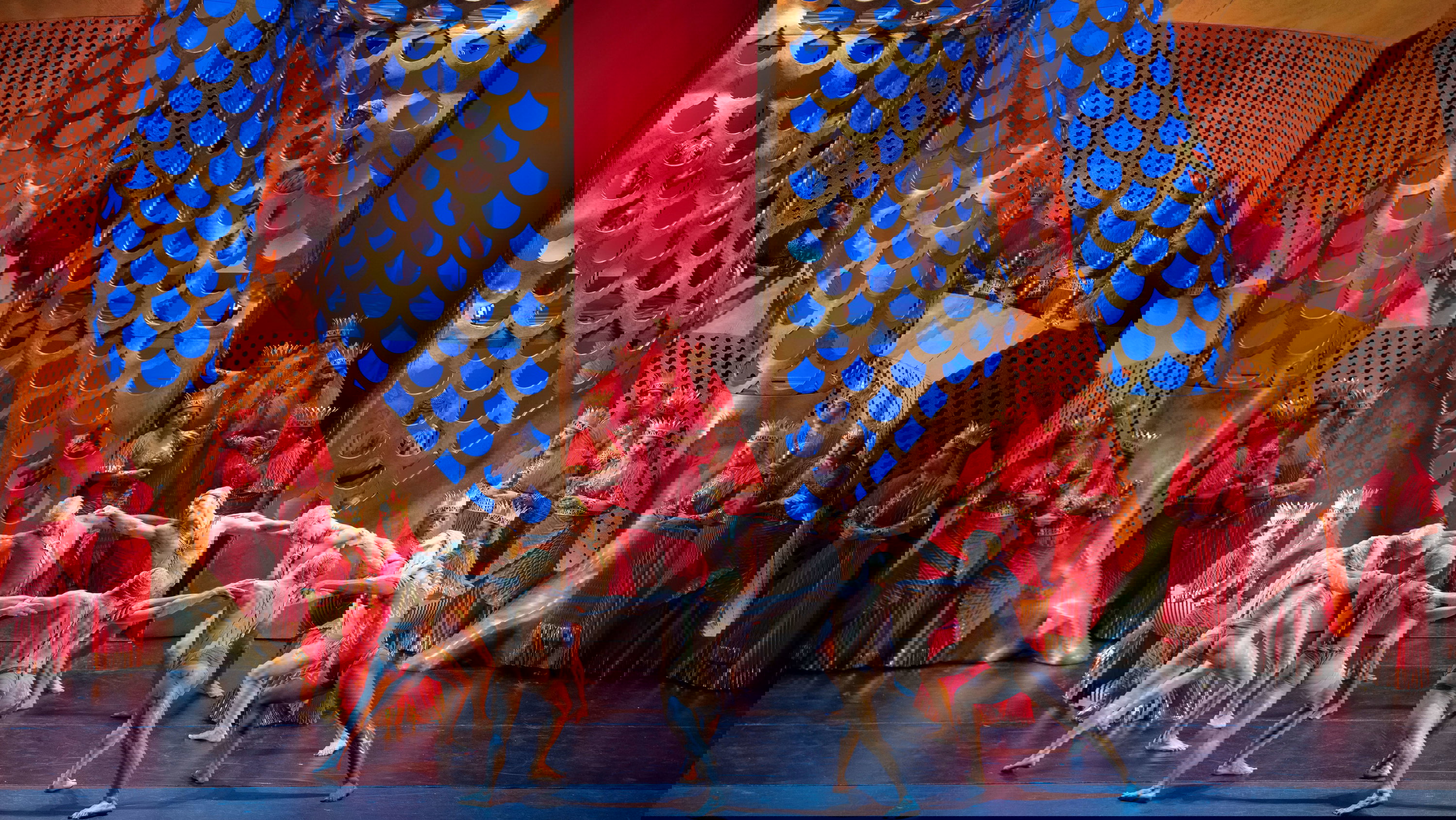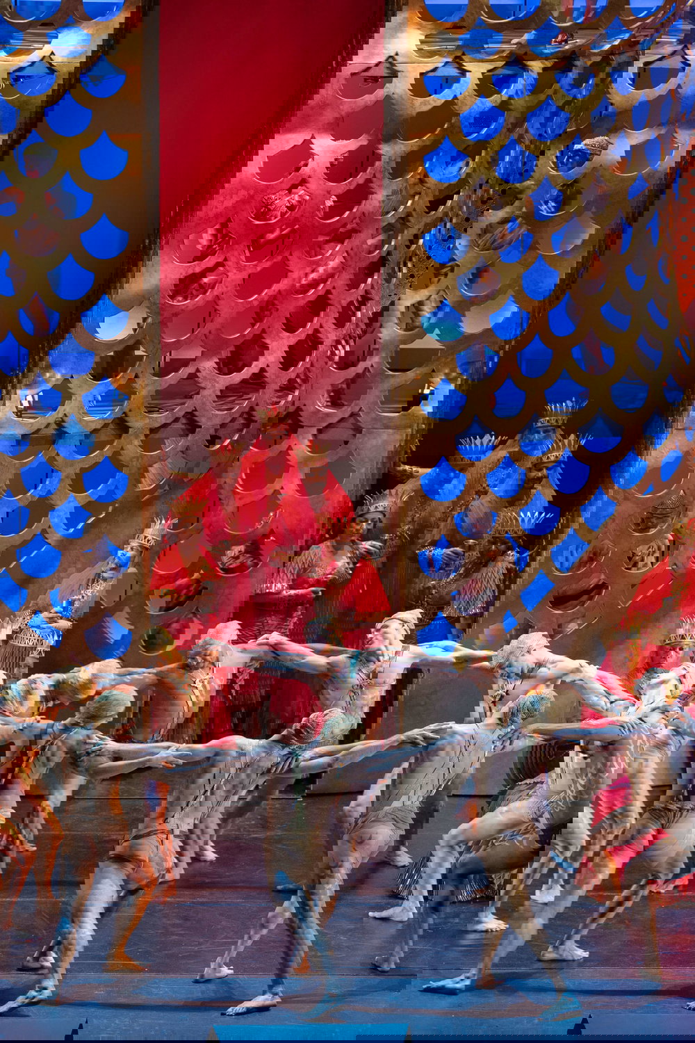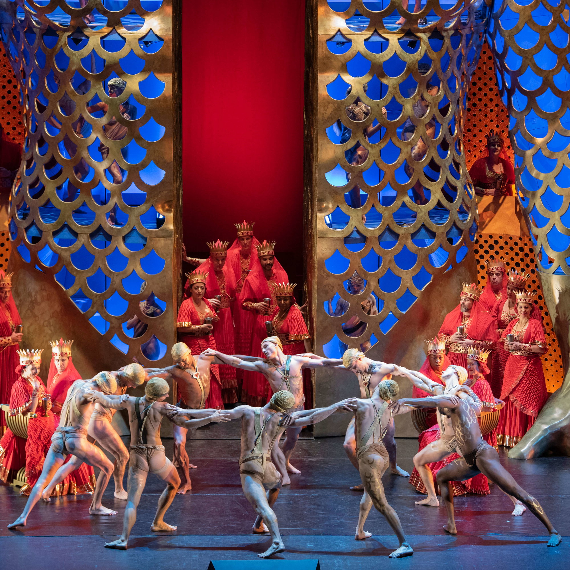 Opeře vdechne velkolepě výpravný rozměr scéna rovněž debutujícího Alexandera Dodge; monumentální je zejména třetí dějství, jemuž dominuje obrovská socha boha Dagona rozetnutá vedví – jeho středem vystupují v průběhu bakchanálií před publikum Filištíni v kostýmech Lindy Cho.