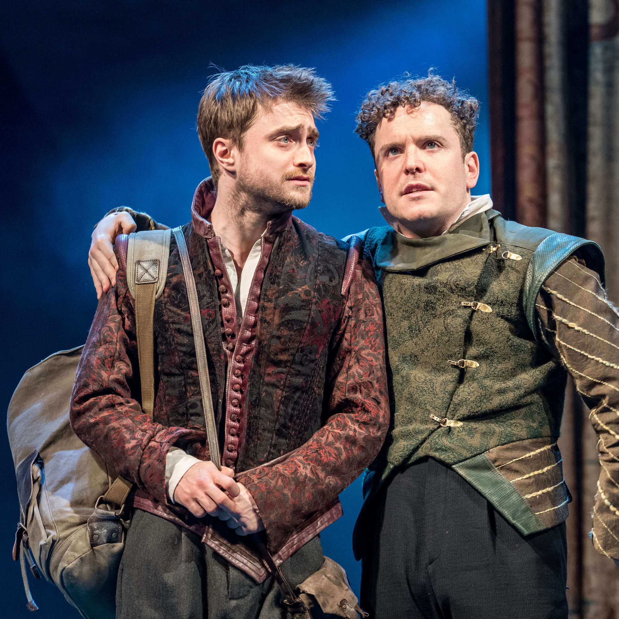 Titulní postavy Hamletových školních kamarádů si rozdělili dva britští herci podobného vzrůstu, kteří už se setkali na natáčení minisérie Zápisky mladého lékaře a jsou kamarády i v soukromí. Joshua McGuire baví v roli výřečnějšího, chytřejšího, frenetického Guildensterna. Daniel Radcliffe, který po představení ochotně zdraví desítky fanoušků filmů o Harry Potterovi ve foyer divadla, dojímá jako klidnější, úzkostnější Rosencrantz. Dvojici doplňuje David Haig (Čtyři svatby a jeden pohřeb) v roli principála kočovných herců, jenž v jeho živelném podání podle jednoho z recenzentů vypadá jako „zlověstný bratr piráta Jacka Sparrowa“.
